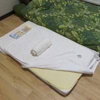 - ベビー布団(防水マットレスカバー付き)、タオル